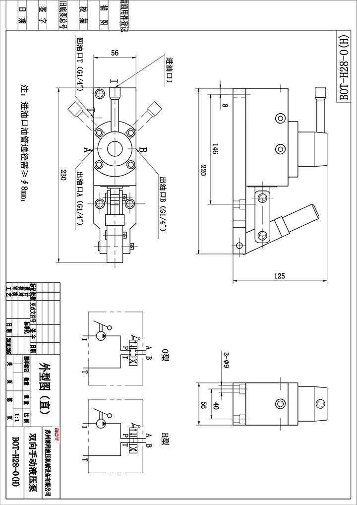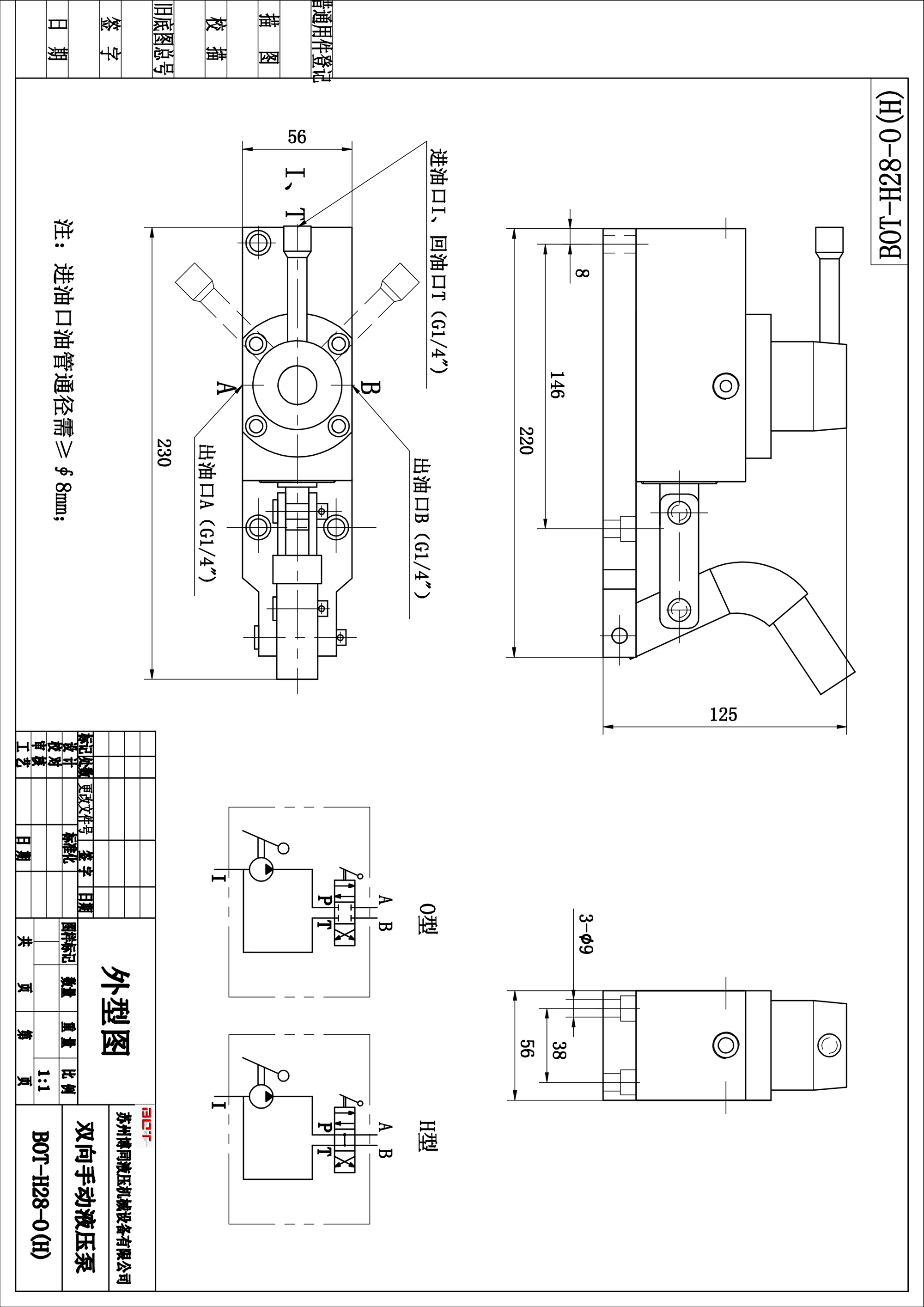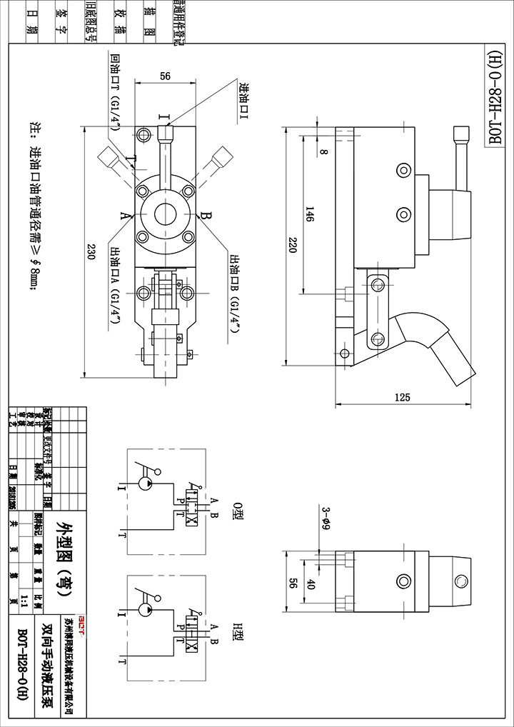本雙向手動液壓泵采用內(nèi)排內(nèi)泄結(jié)構(gòu)。換向集成與泵體一體,通過換向手柄轉(zhuǎn)動,可分別選擇出油A口或B口方向出油打壓,通過進(jìn)油口(回油口)吸油和回油,進(jìn)出油接口分別是G1/4;
